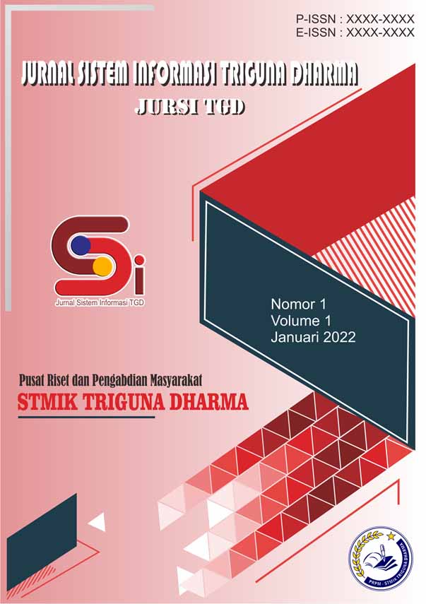 Jurnal Sistem Informasi Triguna Dharma merupakan Jurnal yang menampung hasil penelitian dari Mahasiswa khususnya mahasiswa di Program Studi Sistem Informasi juga menerima hasil penelitian dari kampus berbeda dengan bidang keilmuan yang sama. Jurnal ini menampung publikasi dibidang ilmu komputer khususnya Sistem Informasi, Sistem Pendukung Keputusan, Sistem Pakar, Pengolahan Citra, Jaringan Saraf Tiruan, Data Mining, Security Computer dan seluruh keilmuan dibidang komputer.